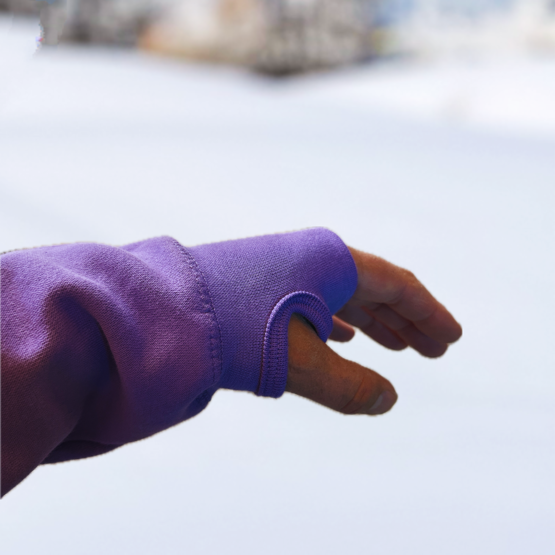 But that’s not all… the comfy ribbed cuffs also feature thumb holes for added warmth.